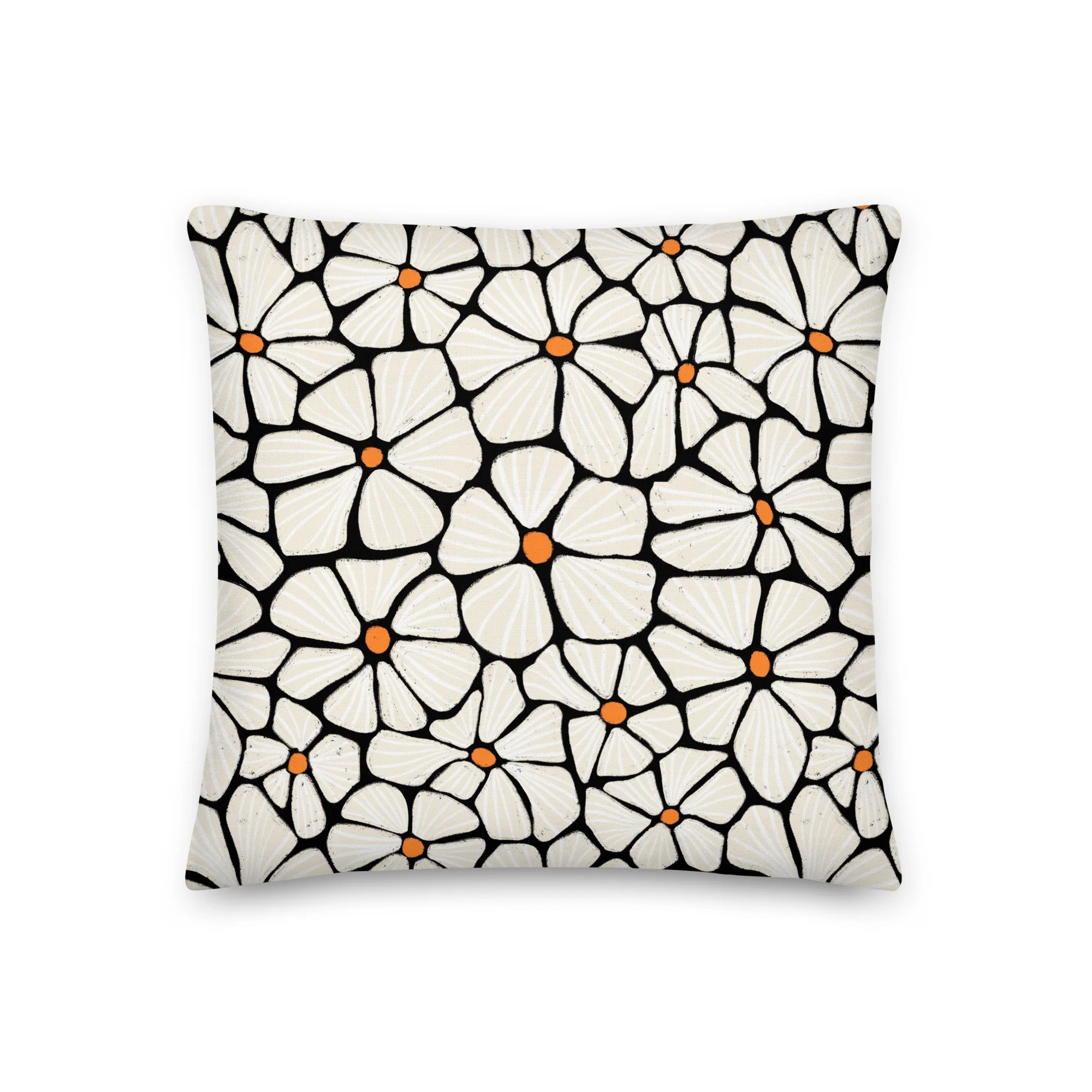 Add some bold, high contrast décor to your bedroom or living room with the Mosaic Flowers White Premium Throw Pillow. A bold and colorful floral design of intersecting blooming white flowers that fit together like a tile mosaic with a hand drawn texture on a black background. The perfect print in a neutral color palette to add texture and pattern to spice up simple modern spaces.