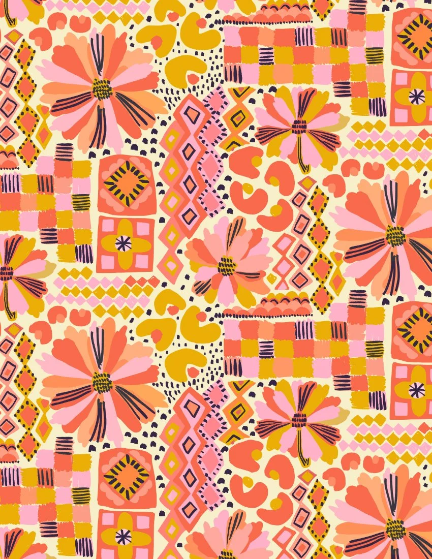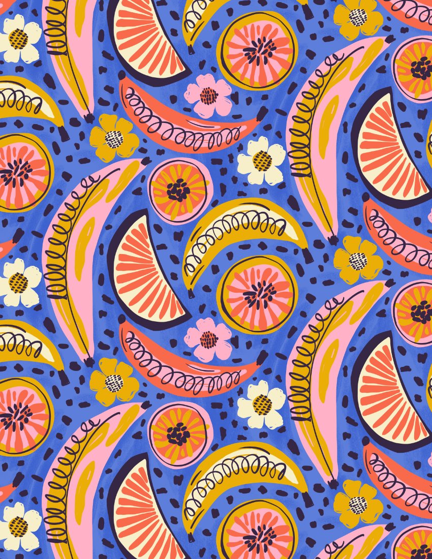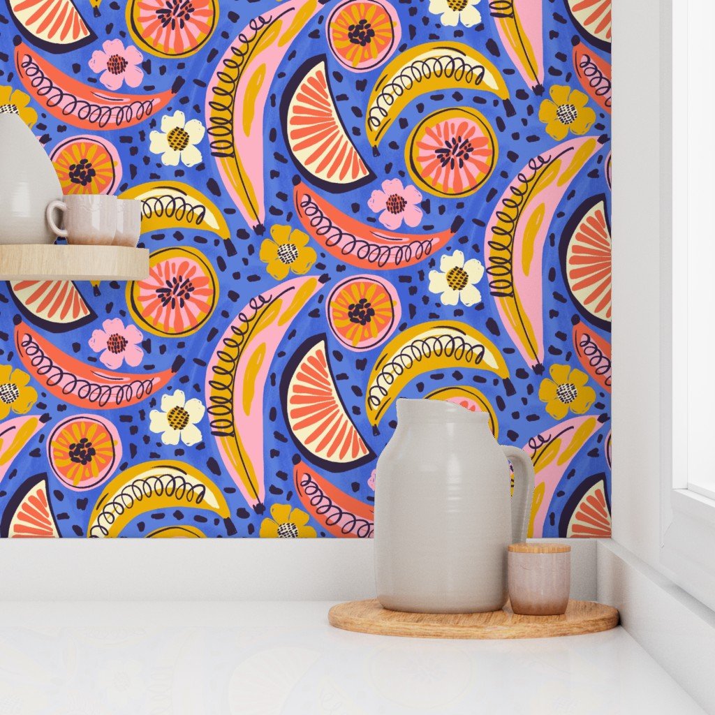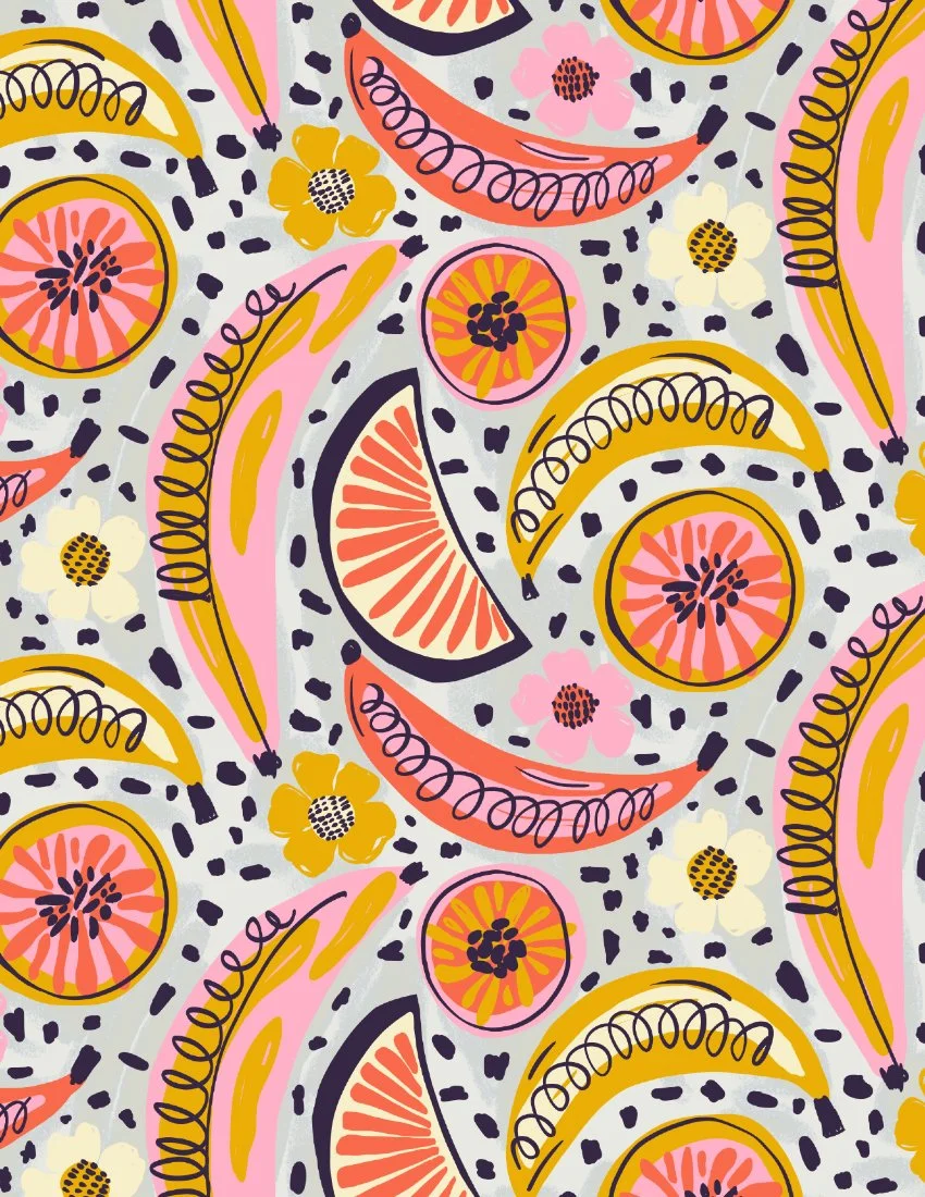 Boho Fruit Market is a bold and colorful surface pattern collection inspired by sunny farmers markets, juicy citrus slices, tropical florals and hand-drawn textures. Designed for DIY sewing, quilting, statement wallpaper and cheerful home decor, these playful prints mix retro fruit motifs with bohemian geometrics and modern abstract coordinates. Perfect for summer dresses, bags, kitchen decor, kids rooms, accent walls and dopamine-filled interiors.