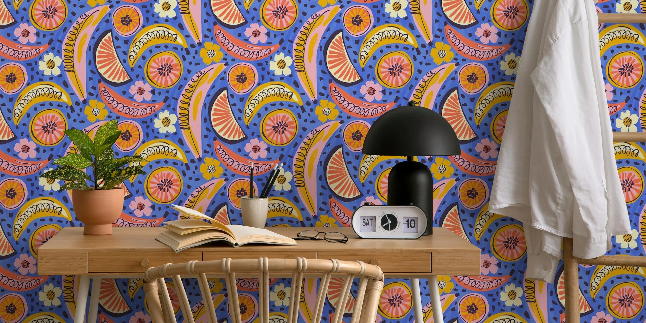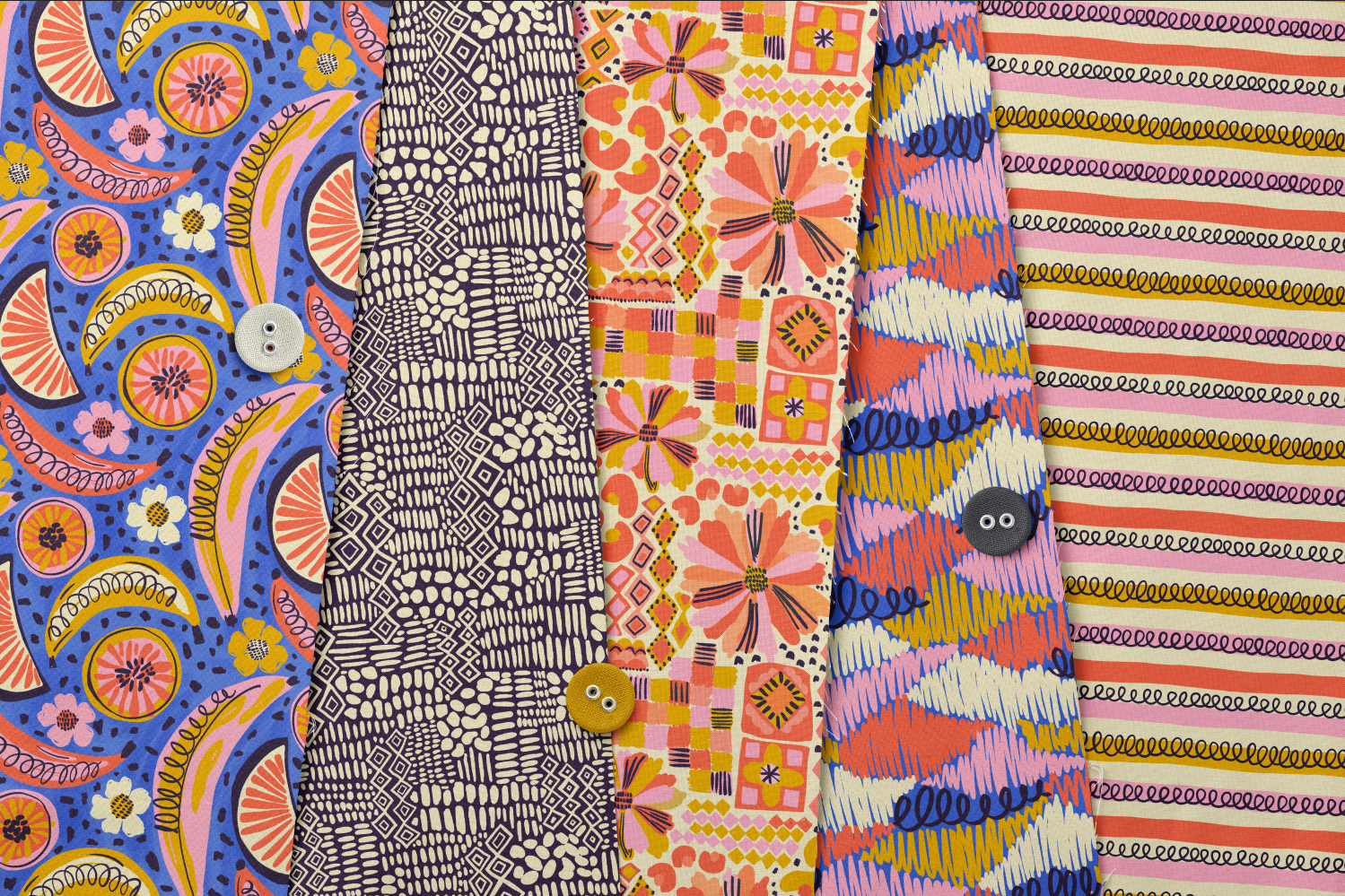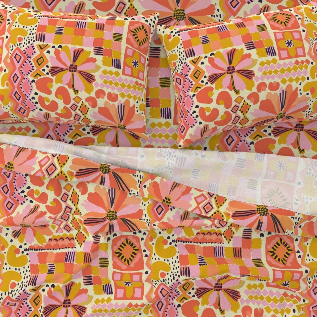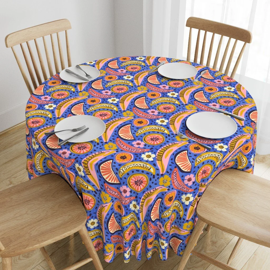 Boho Fruit Market is a bold and colorful surface pattern collection inspired by sunny farmers markets, juicy citrus slices, tropical florals and hand-drawn textures. Designed for DIY sewing, quilting, statement wallpaper and cheerful home decor, these playful prints mix retro fruit motifs with bohemian geometrics and modern abstract coordinates. Perfect for summer dresses, bags, kitchen decor, kids rooms, accent walls and dopamine-filled interiors.