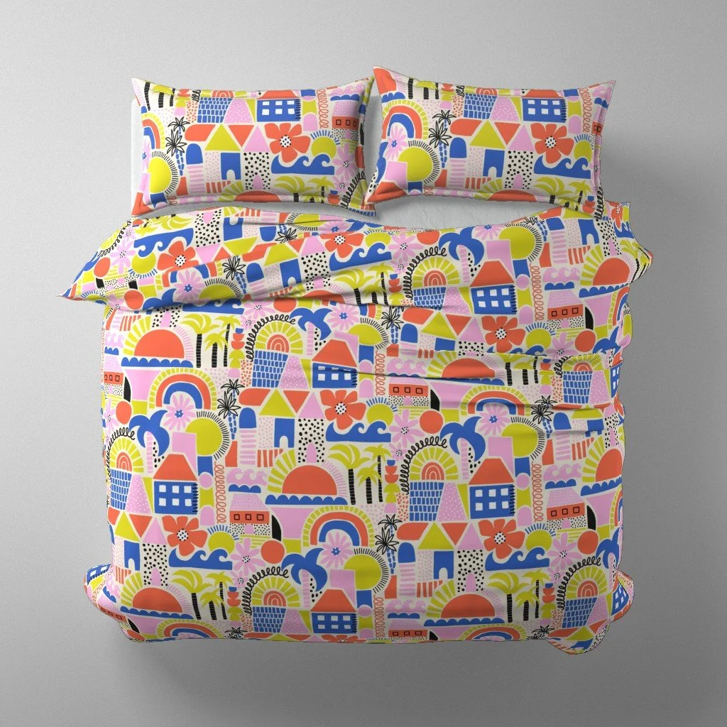 Inspired by warm evenings at the beach, retro travel posters, and vibrant seaside towns, the collection combines bold graphic shapes with joyful colors. The designs capture the feeling of walking along a sunny boardwalk, watching the sun dip below the ocean, and enjoying the relaxed rhythm of coastal life.