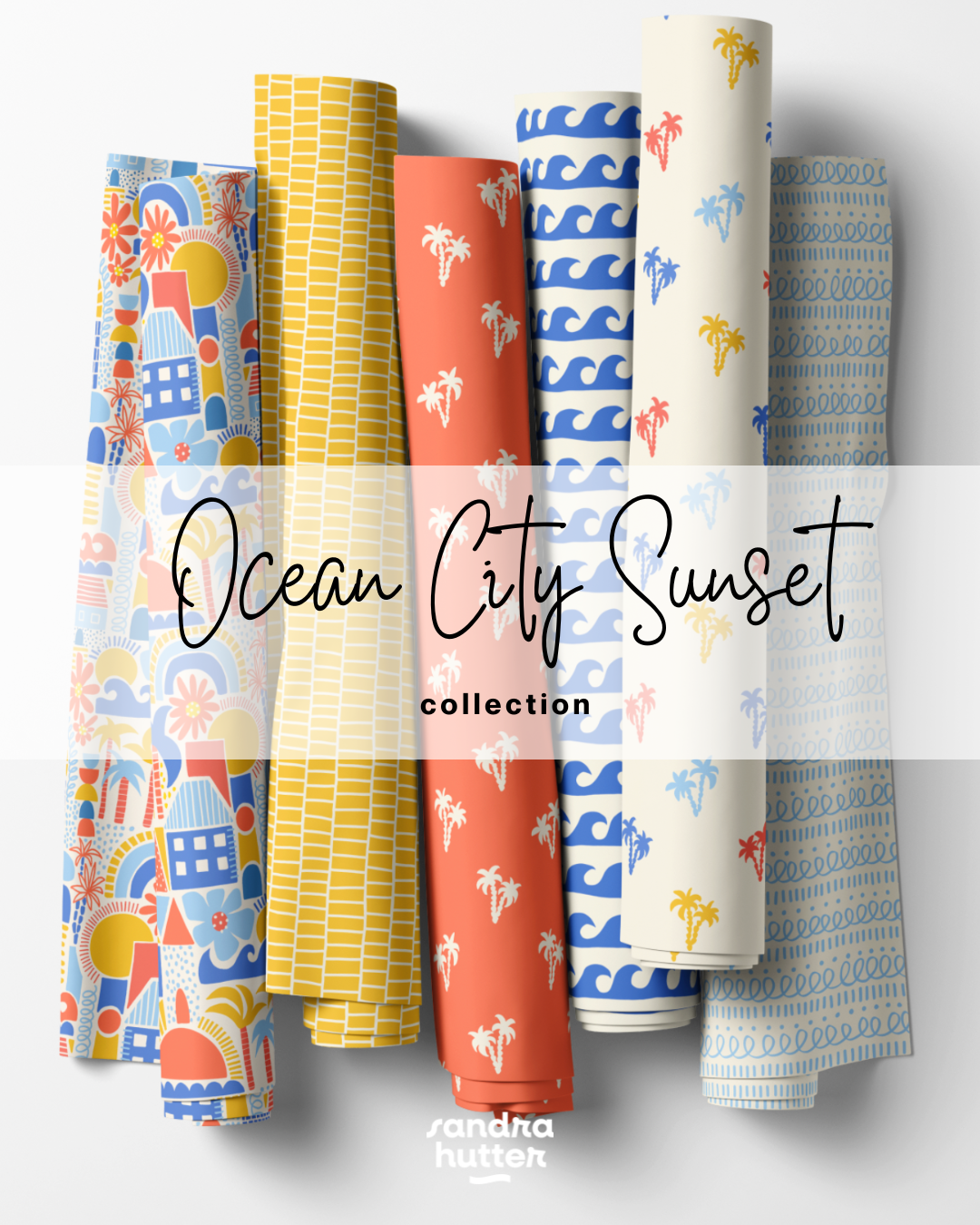 Ocean City Sunset is a playful coastal inspired collection filled with sunshine, waves, colorful seaside architecture, and tropical palm trees.