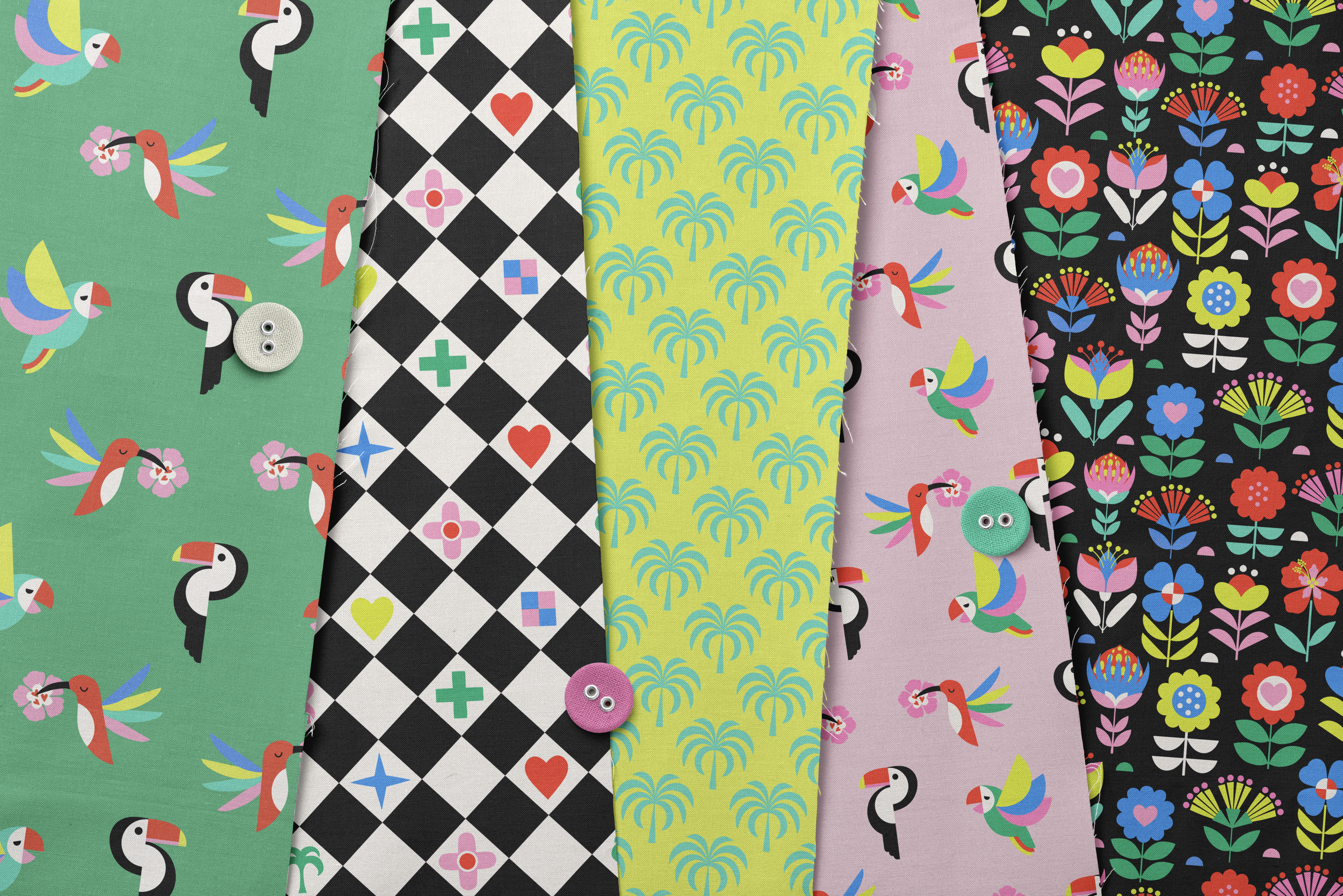 This collection is ideal for products lines destined for the tropics that aim to draw eyes. Does your business specialize in home decor? Launch living room and bedroom decor items with patterns covered in tropical motifs. Release a new clothing line fun and flirty sundresses or summer shorts covered with birds with brightly colored wings. Or, embrace the bold look vibrant palm tree silhouettes in neon colors on everything from wallpaper to vacation ready beach towels and water bottles. Whatever your product design goals, make a creative and playful choice by using the Palm Tree Pals Collection.