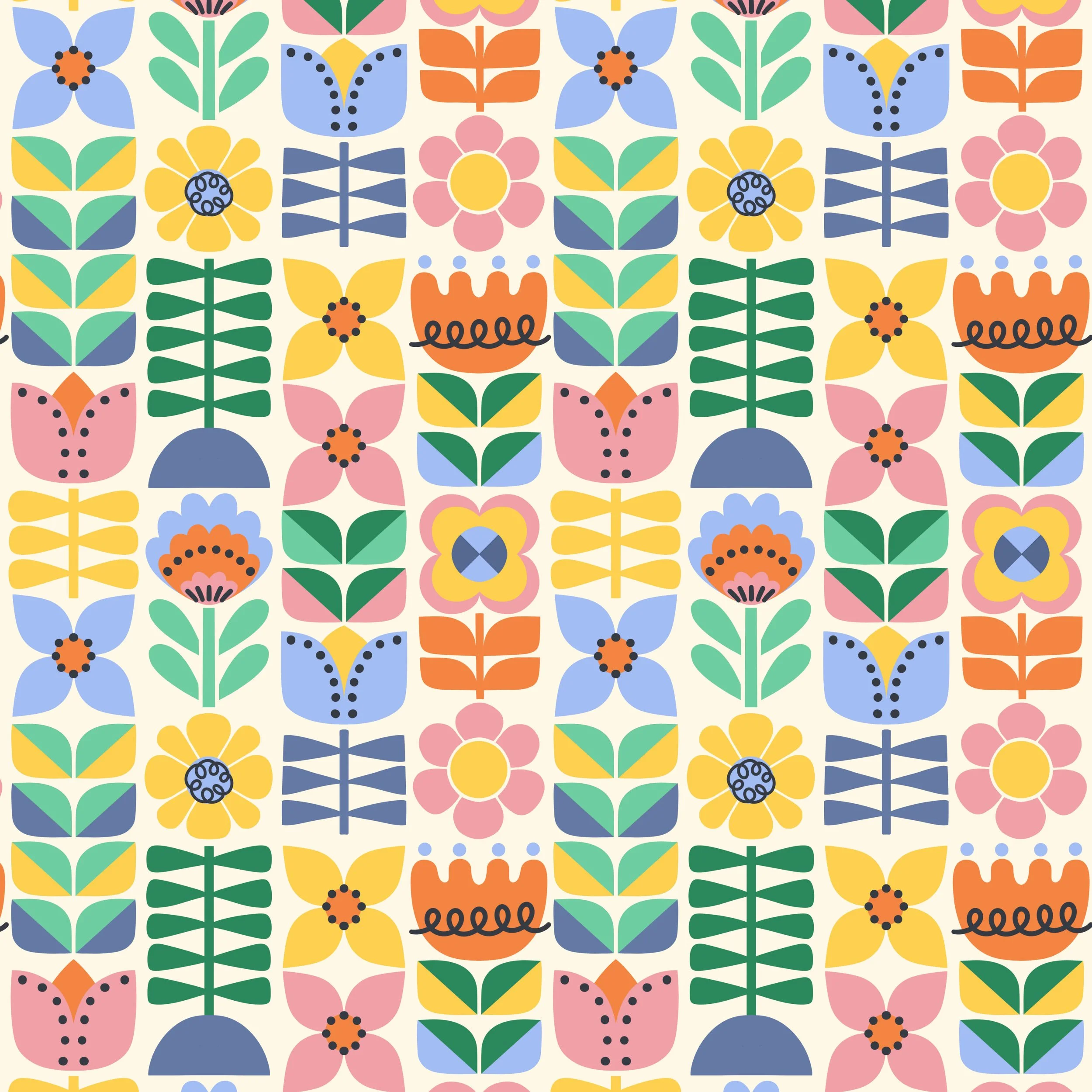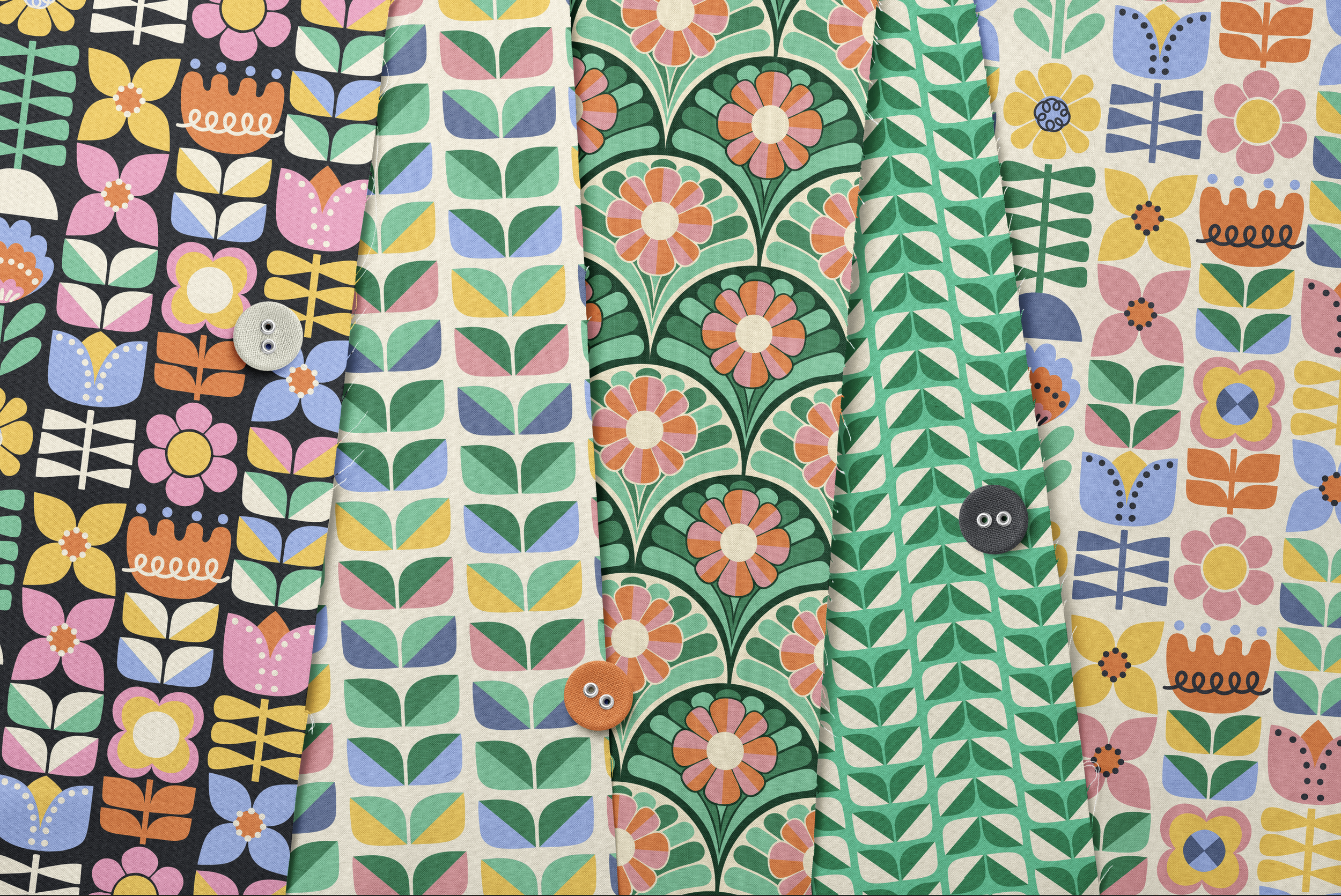 Introducing the Retro Folk & Flora Collection. A colorful collage of folk art style florals and geometric botanical patterns in a fun retro inspired pastel color palette. With playful patchwork style flower girds, dazzling blooming floral fan designs, and sleek color-block leaf motif stripes this collection offers plenty of mix-and-match style options.